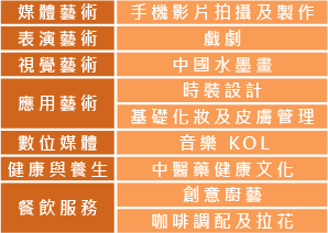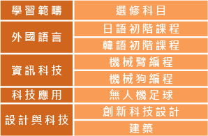初中選修科涵蓋11個學習範疇,包括外國語言、資訊科技、科技應用、設計與科技、媒體藝術、表演藝術、視覺藝術、應用藝術、數位媒體、健康與養生及餐飲服務。本學年共有16個選修科目,旨在與其他初中科目相輔相成,構成靈活的科目組合,照顧學習多樣性,讓學生能體驗寛廣而均衡的學習經歷。